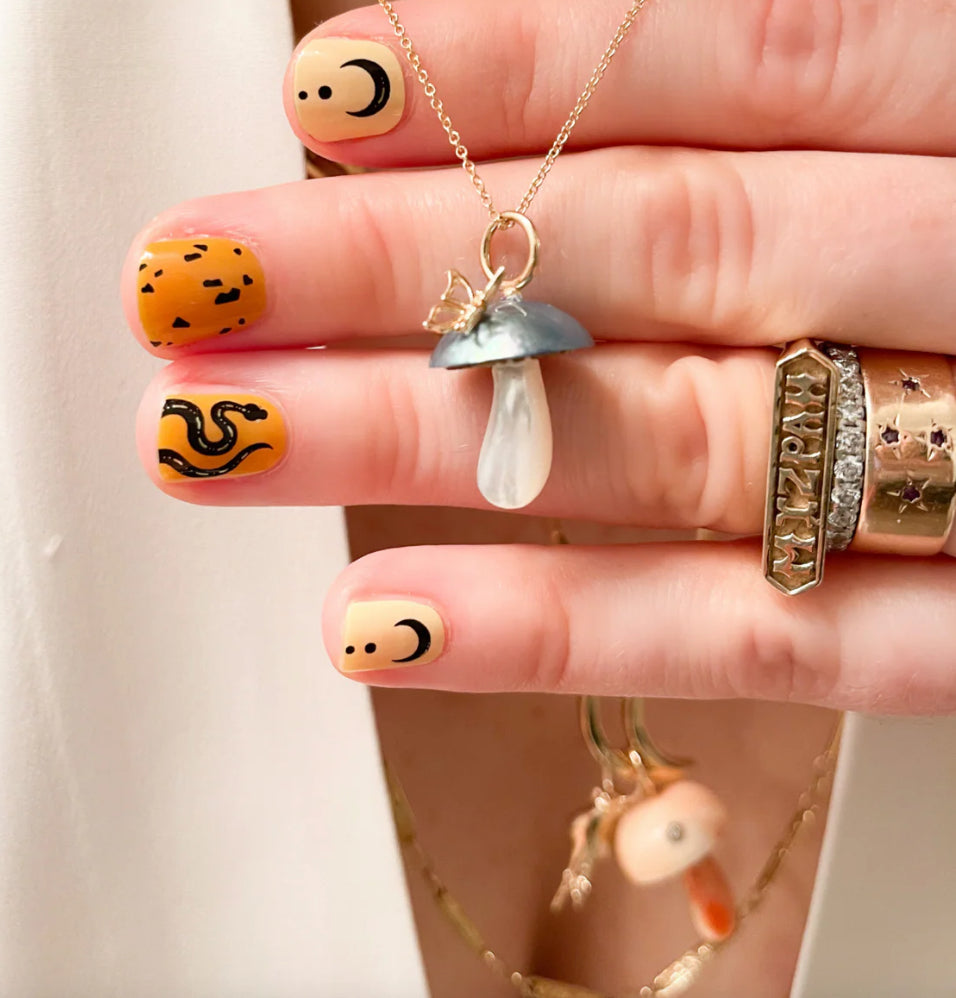- Hand-carved mushroom design featuring a whimsical snail motif