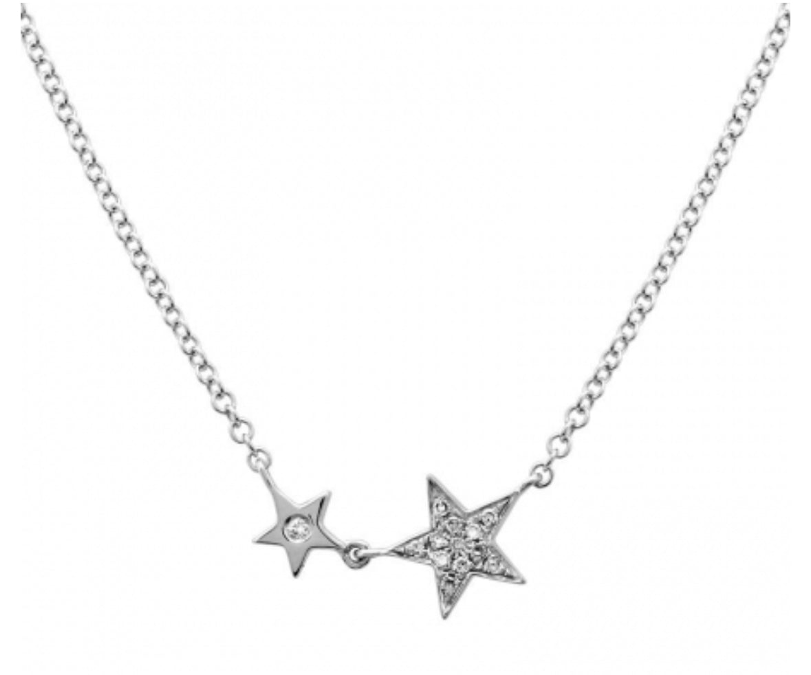 - Two Delicate Stars with Diamond Details are suspended on a white gold chian